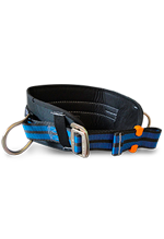 Cinturón liniero con refuerzo lumbar, cinta regulable por hebillas y presilla para excedentes de cinta.