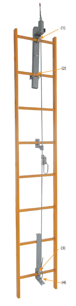 El soporte inferior se coloca en el peldaño inferior y cuenta con una sola grampa (3) de sujeción. Por su diseño específico queda perfectamente sujetado junto al peldaño inmediato superior. Este nuevo sistema de anclaje reduce ampliamente la posibilidad de un movimiento involuntario de dicho soporte. Por último posee una grampa tensora(4) que sujeta el cable de acero de simple instalación y tensión.