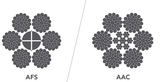 Construcción AFS: Ø hasta 8.00 mm inclusive 6x37 M. Mayores a 8.00 mm: 6x31, 6x36 y 6x41 Warrington Seale, según diámetro y grado. Construcciones AAC más comunes según grado y diámetro: 6x31 Warrington Seale, 6x36 Warrington Seale, 6x41 Warrington Seale.Revestimiento: natural o galvanizado, en función del diámetro y construcción. Revestimiento: natural o galvanizado.Norma ref.: ABNT/ ISO 2408/IRAM 547. Consulte a PETROVISA por diámetros o resistencias no especificados en la tabla.